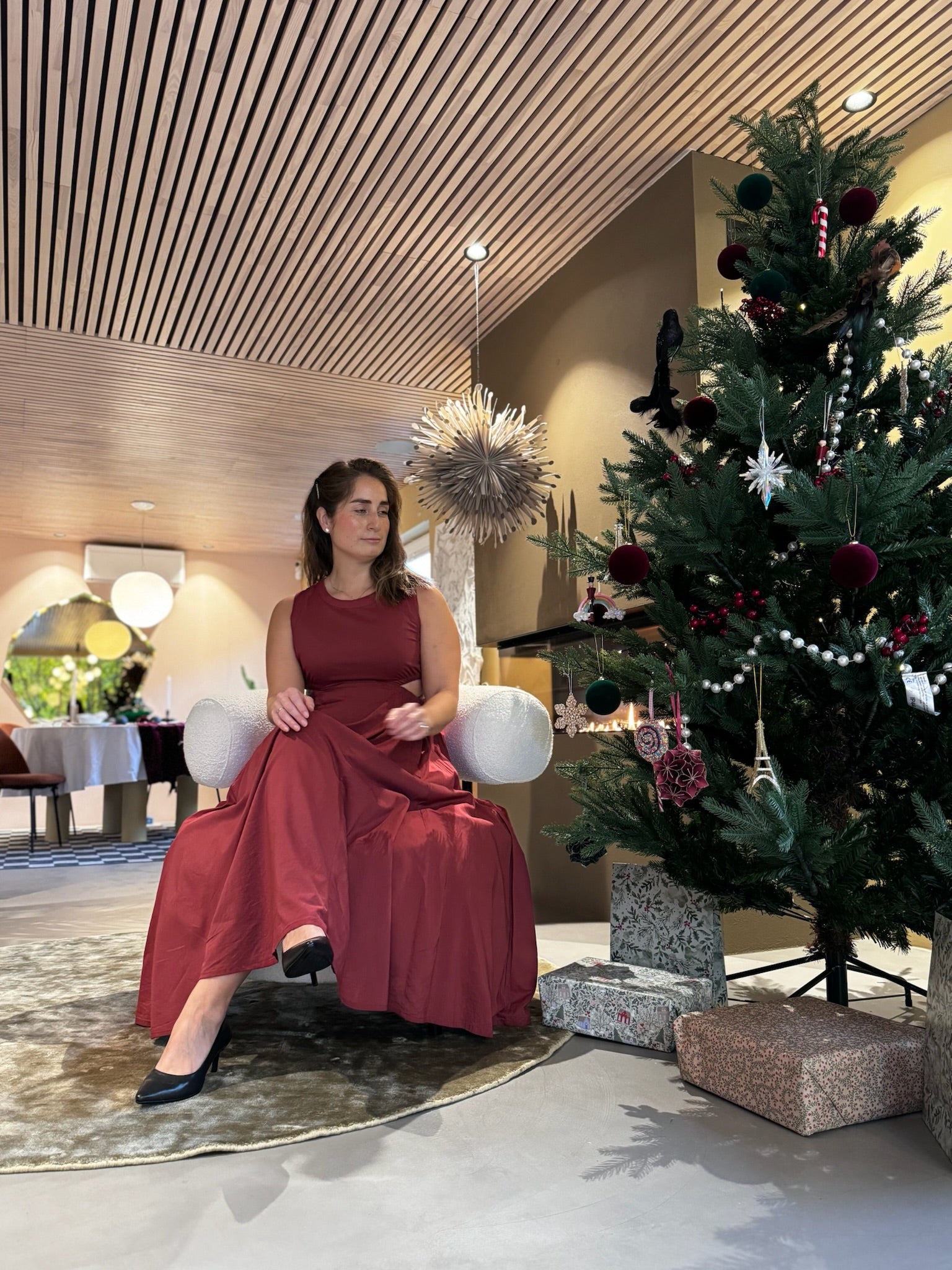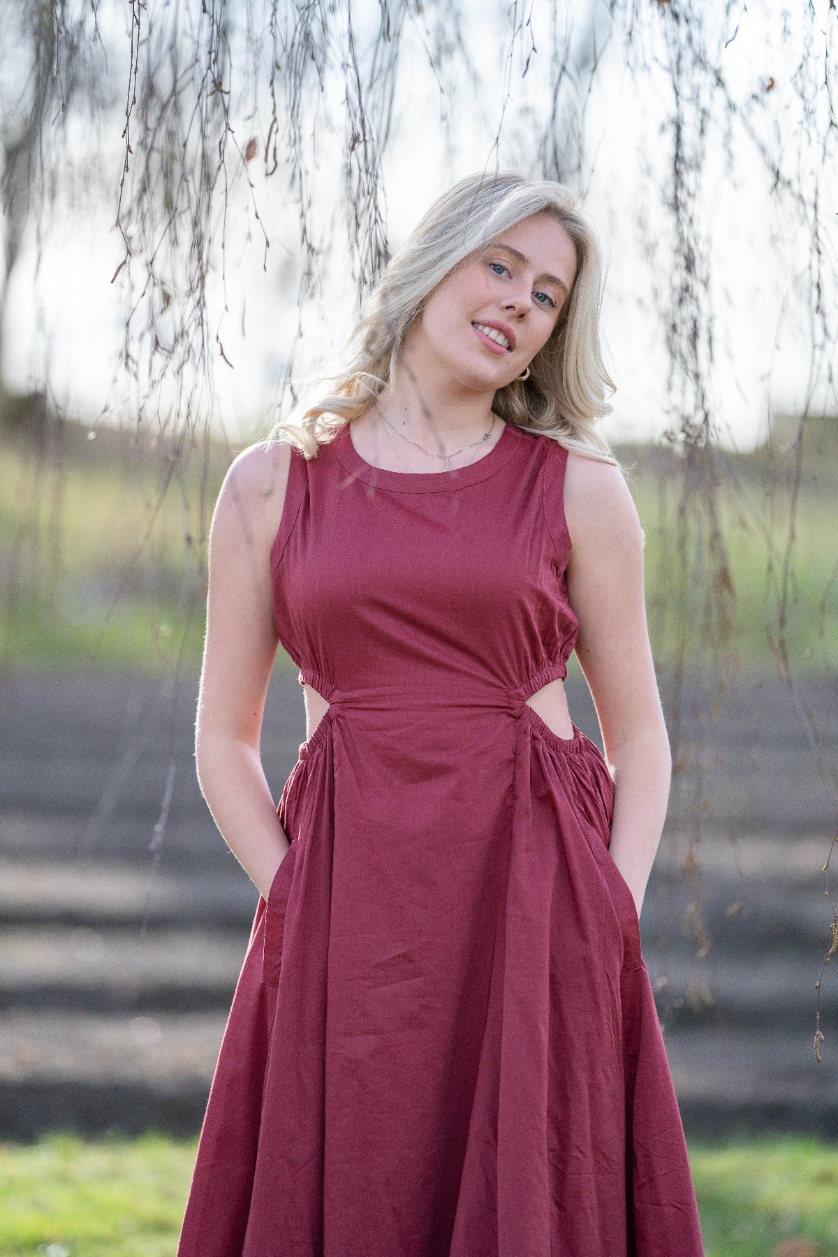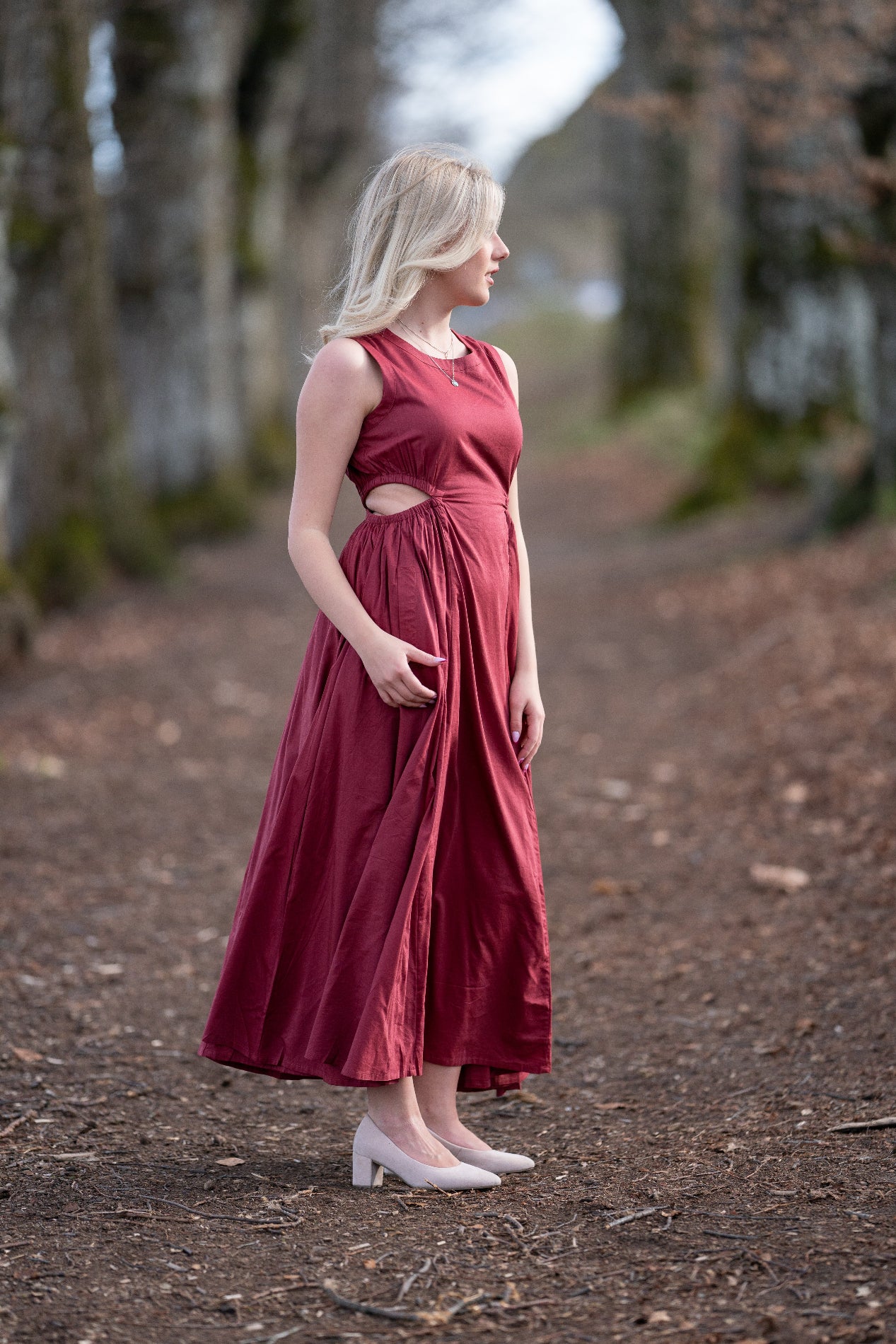 Kjolen er et blikkfang med nydelig rust rød farge og en elegant silhuett. På sidene har kjolen en åpning med behagelig strikk. og praktiske lommer. Kjolen passer perfekt for både hverdagsbruk og spesielle anledninger.