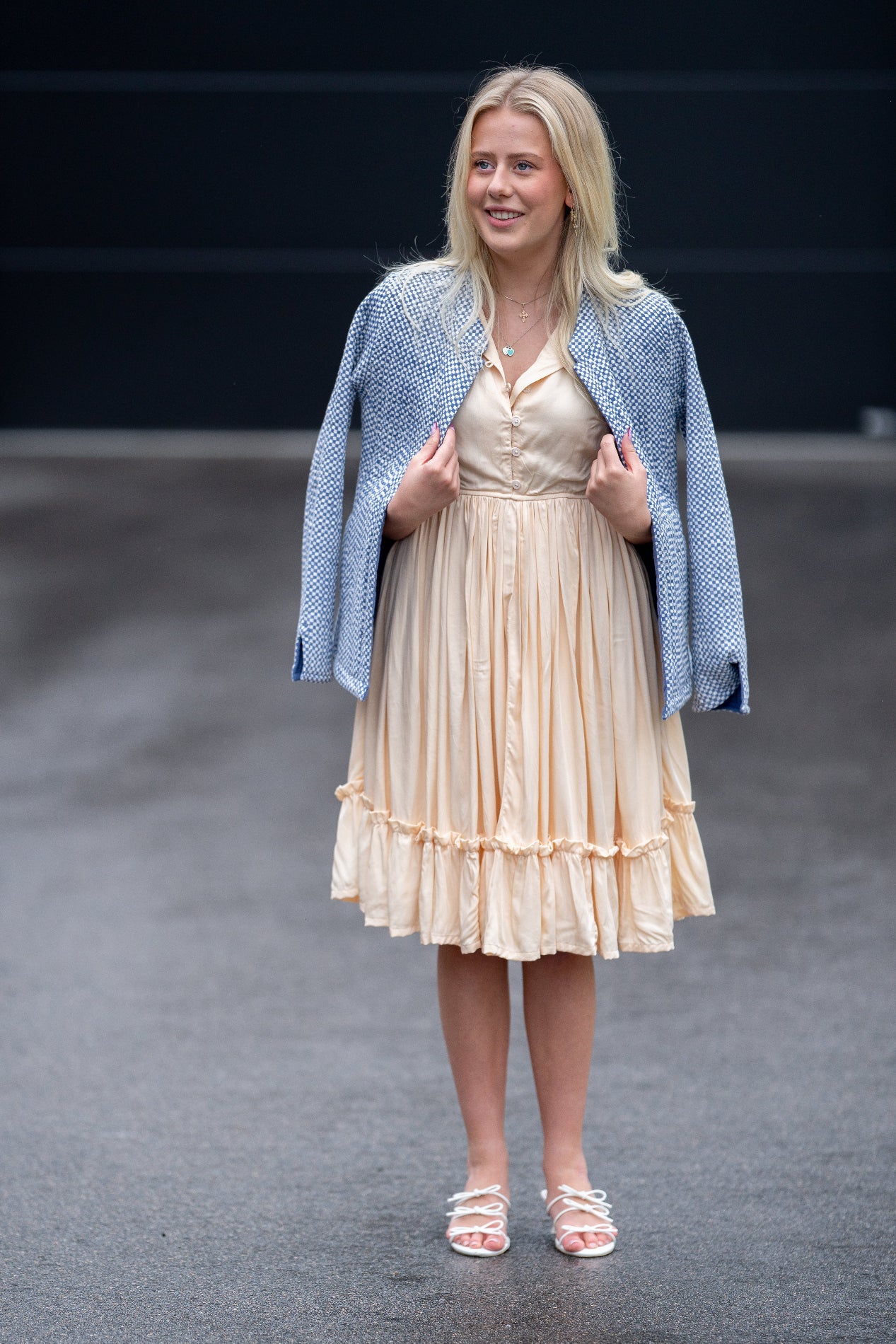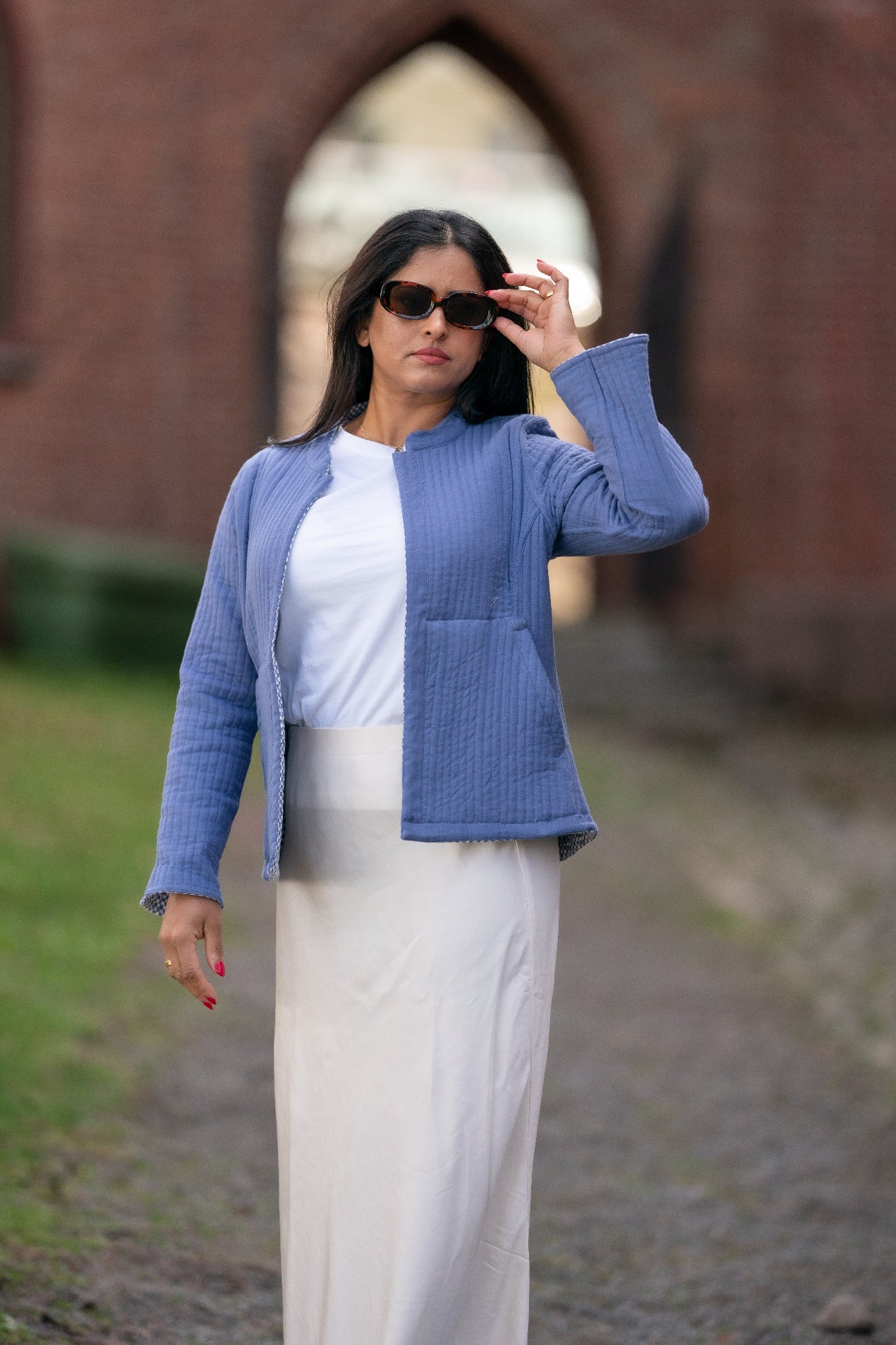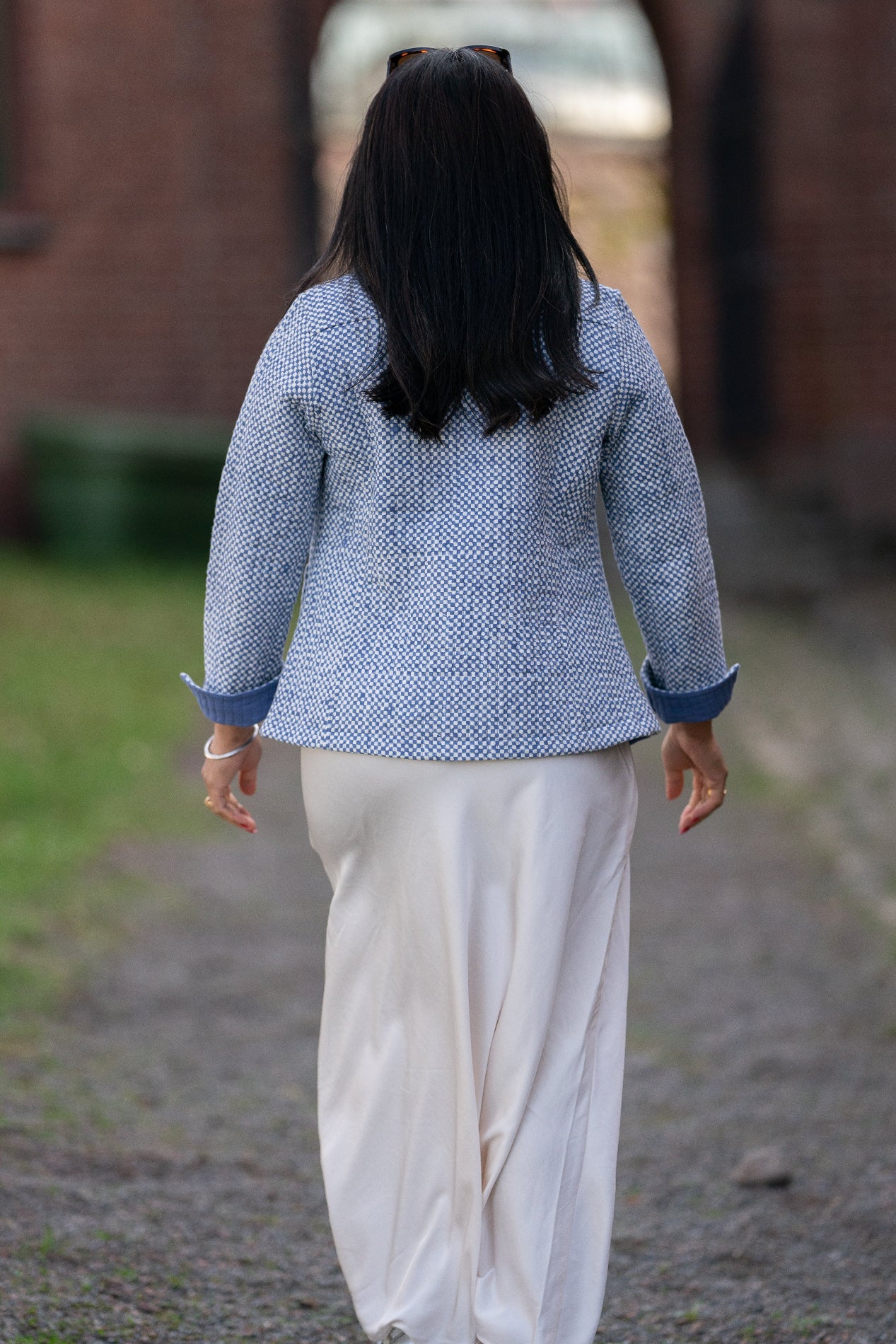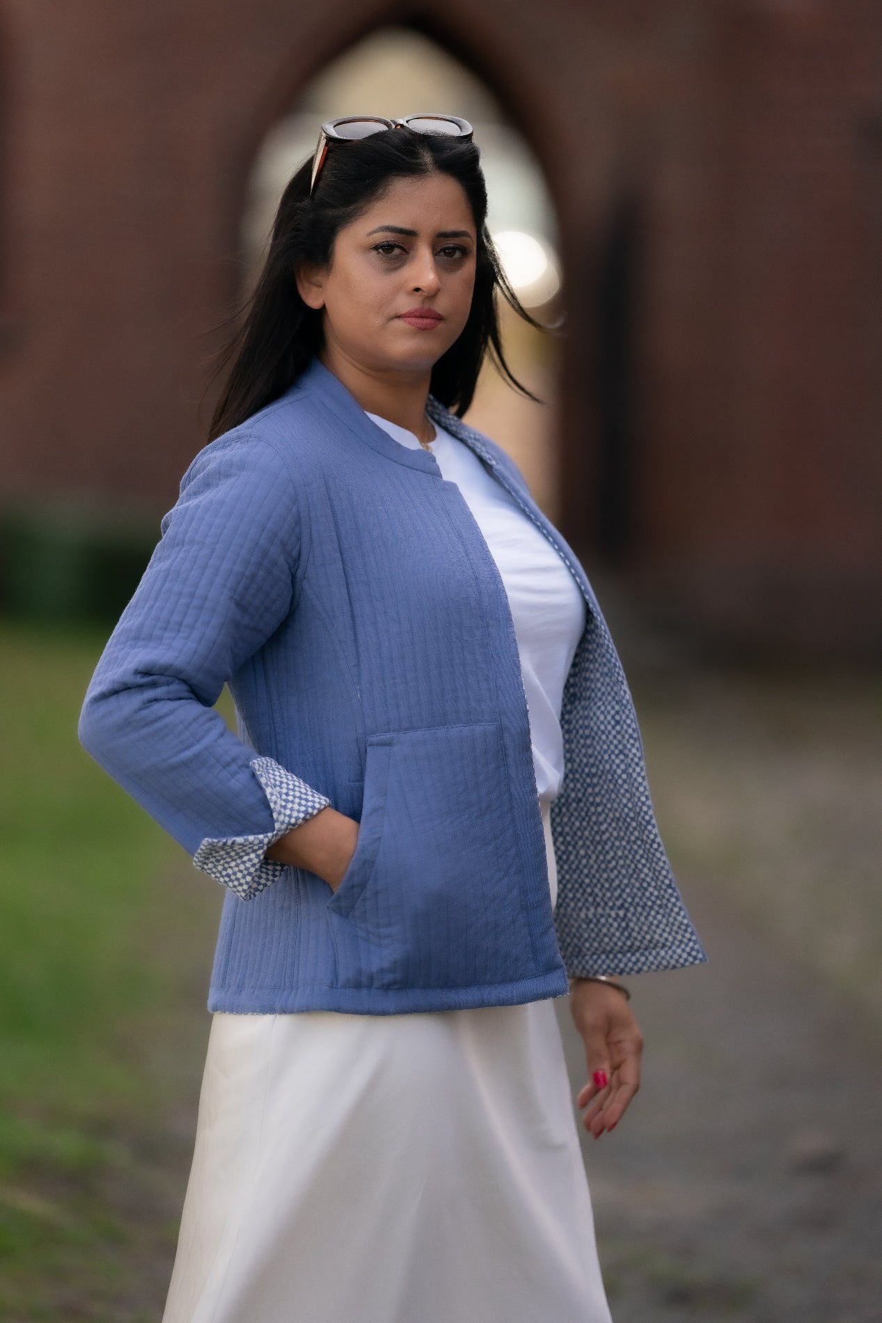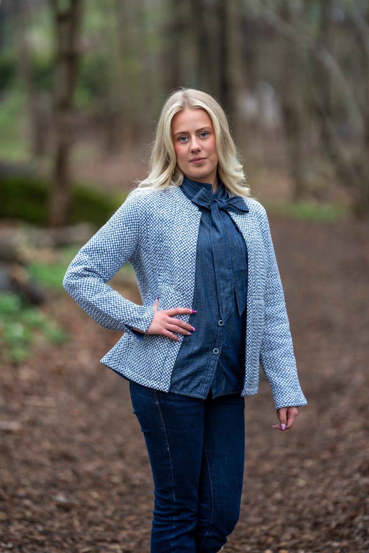 Den ene siden presenterer et delikat mønster av små, hvite ruter mot en blå bakgrunn, som gir et elegant utseende. Ved å enkelt vende jakken får du en ensfarget, stilsikker blå side – perfekt for dager hvor du ønsker et mer minimalistisk uttrykk.