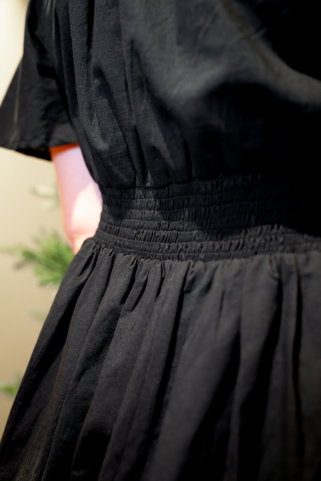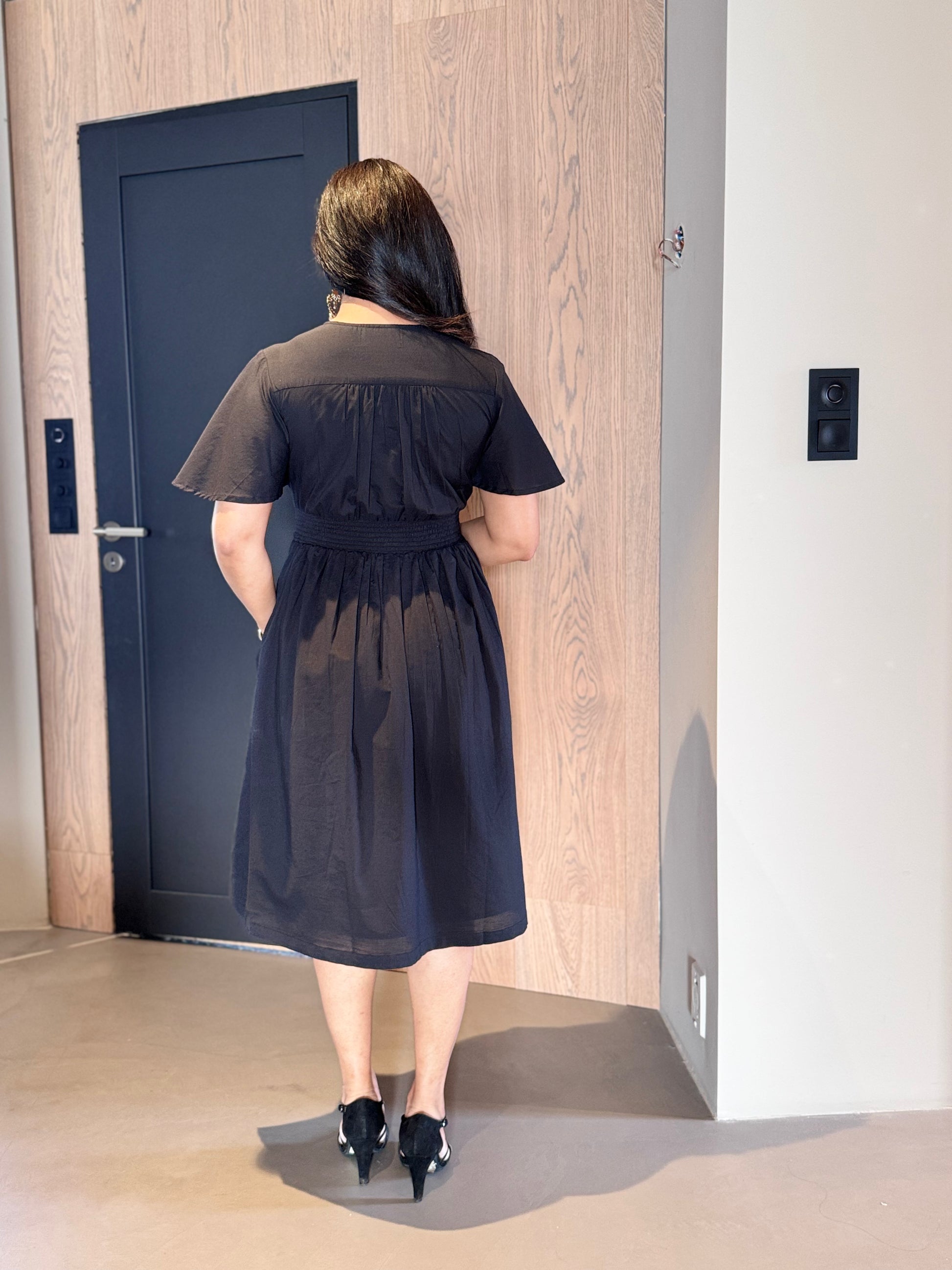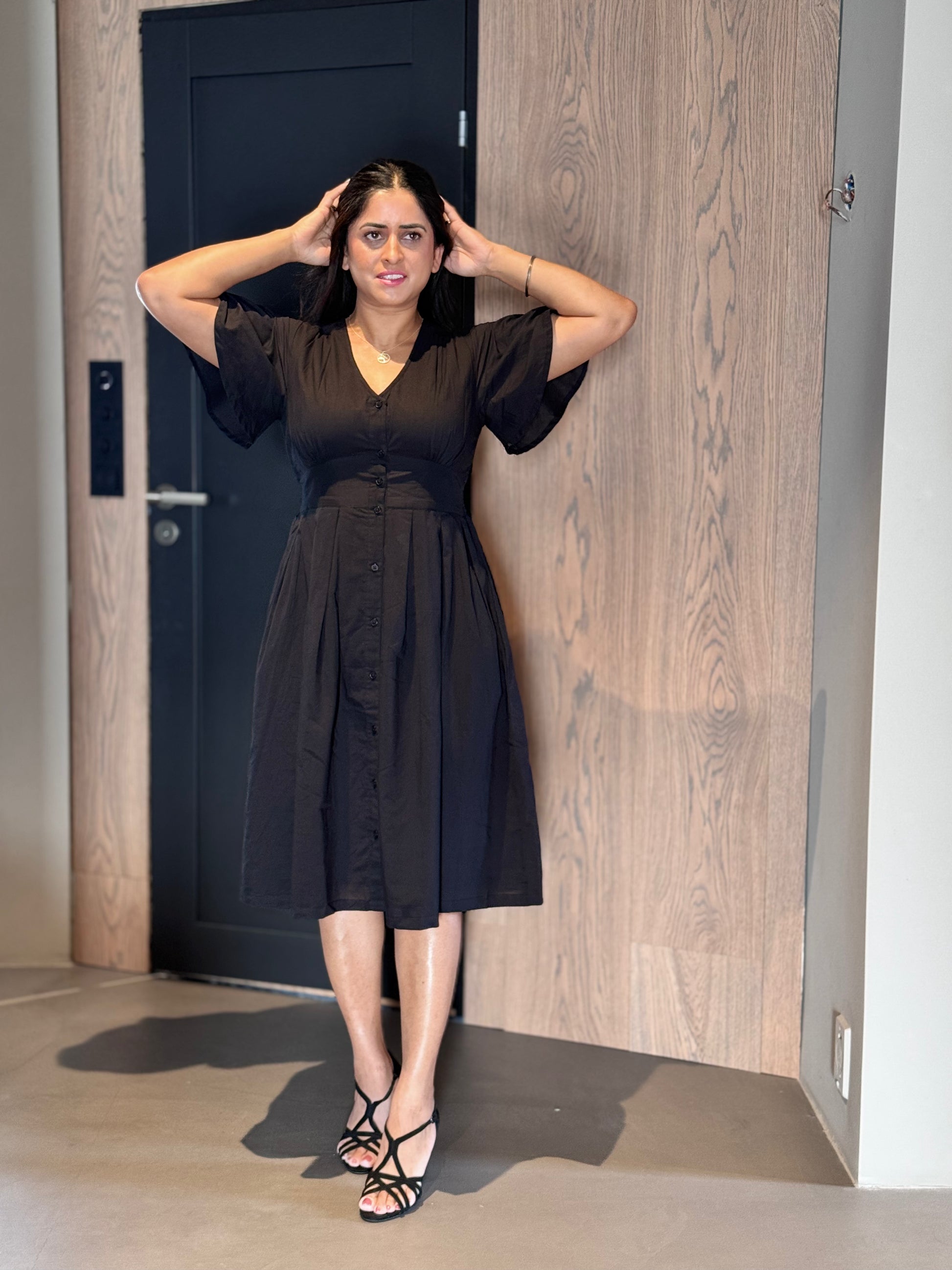Kjolen har praktiske lommer og strikk i ryggen. Kjolen er i en dempet sort farge og stoff av 100% bomull.