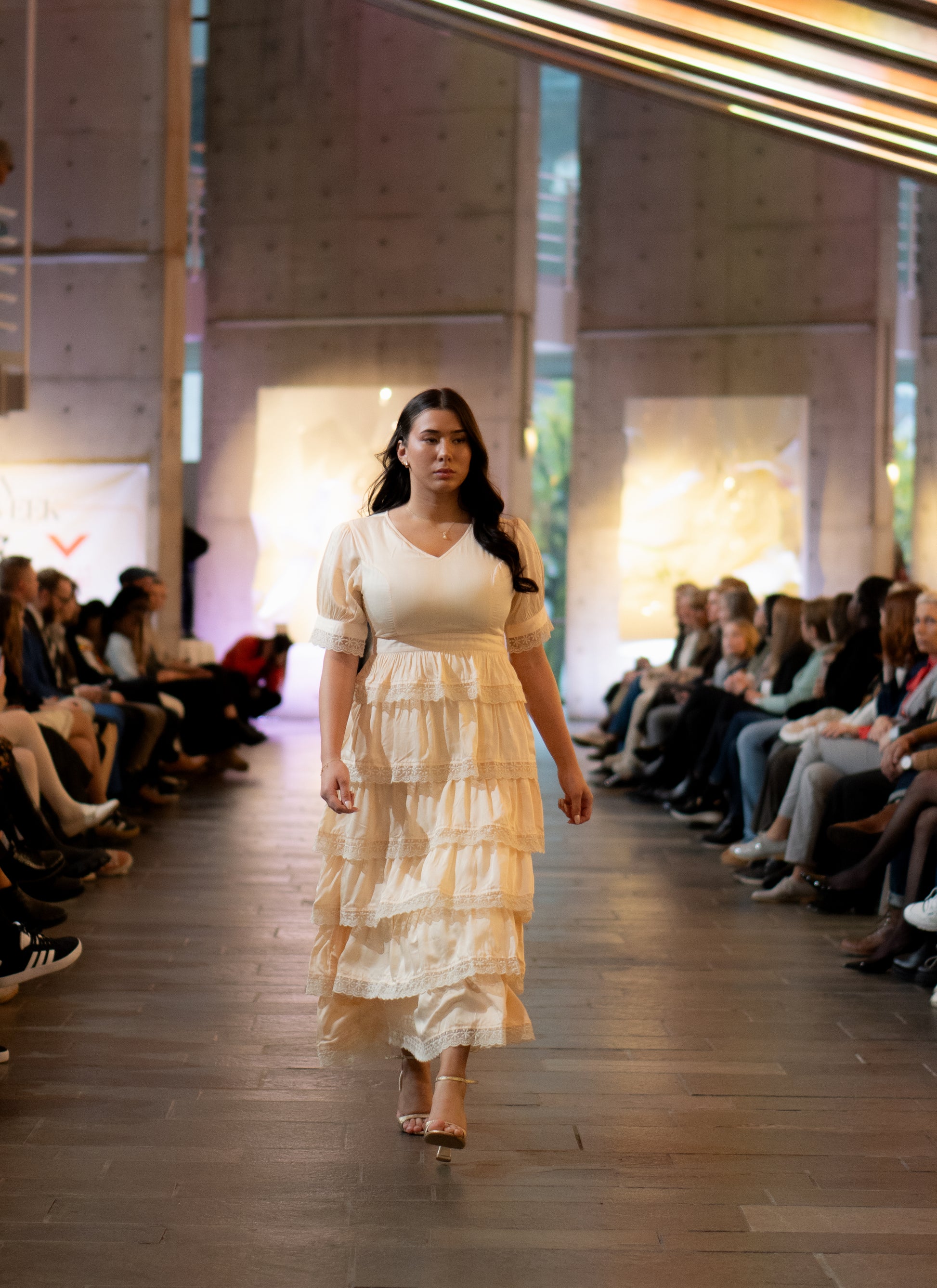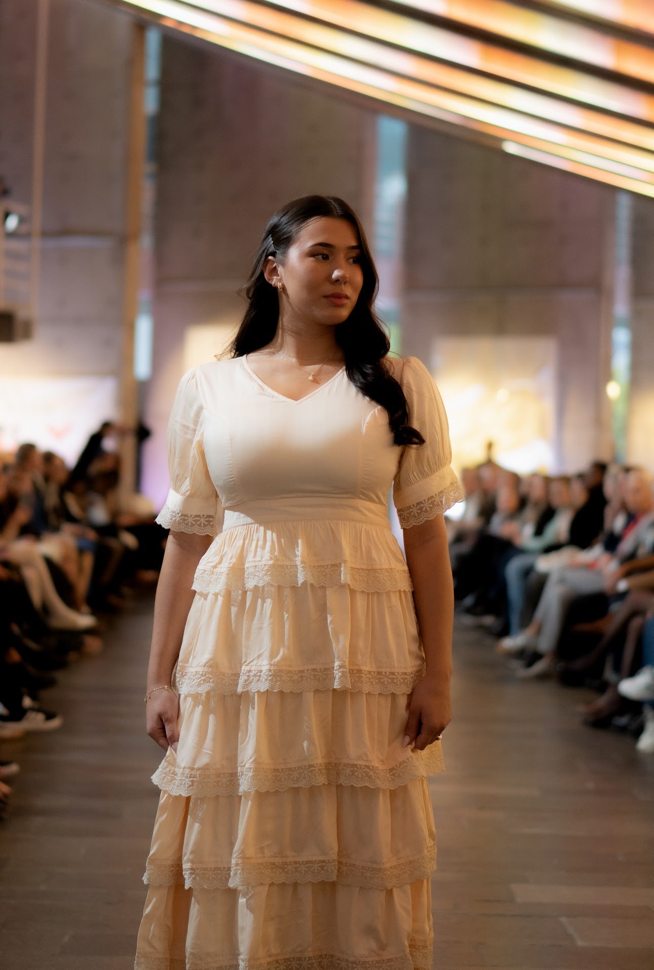 En drøm av en kjole inspirert av den delikate og dekorative formen til Honningblomsten og Blåregn. Denne lange kjolen utstråler en tidløs sjarm med sitt etasjerte skjørt som skaper en nydelig silhuett og bevegelse. Hver etasje er elegant avsluttet med fine blondekanter, som gir kjolen et sofistikert og feminint preg.